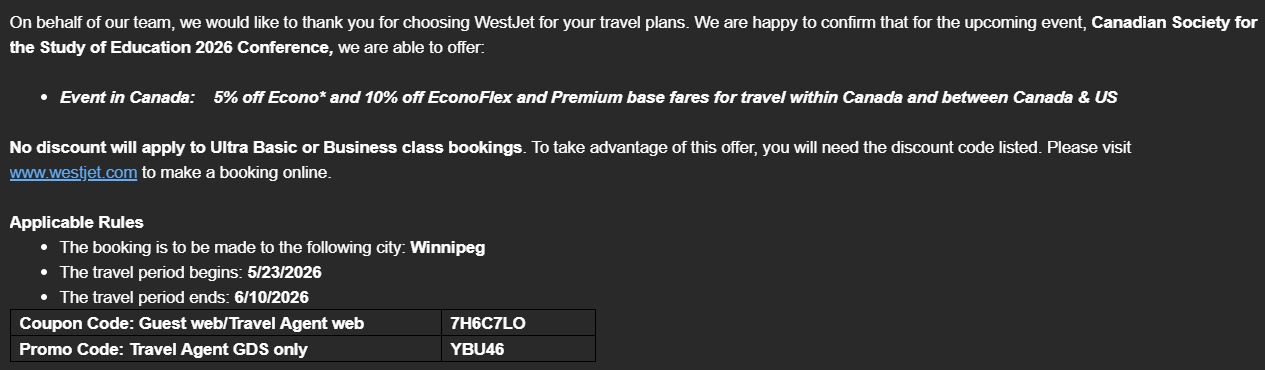 CSSE’s 54th annual conference dates are tentatively Saturday, May 30 (preconference day) to Wednesday, June 3, 2026. The conference will be held at the University of Winnipeg in Winnipeg, Manitoba, with online presentations occurring on Tuesday, May 19, 2026 for those unable to attend in person.
